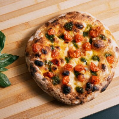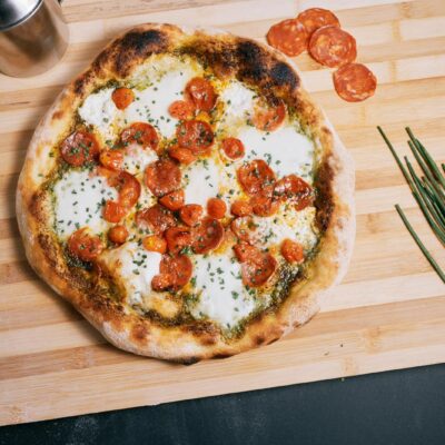 Pesto, fior di latte, queso de cabra, pepperoni picante, tomates cherry asados, ciboulette