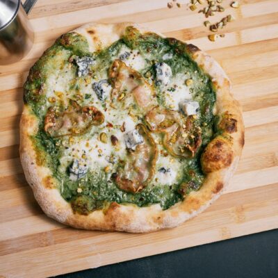 Salsa de espinacas Enzo's, fior di latte, guanciale, gorgonzola, pistacho y aceite de oliva