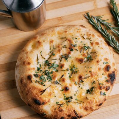 Salsa de tomate, parmesano, burratina, hiervas frescas, fruto seco y aceite de oliva