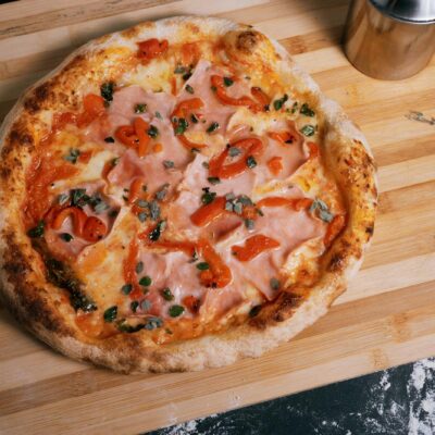 Salsa de tomate, parmesano, doble mozzarella, jamón natural, pimiento asado, orégano fresco y aceite de oliva