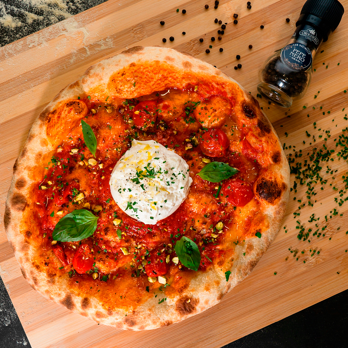 Salsa de tomate, parmesano, burratina, hiervas frescas, fruto seco y aceite de oliva