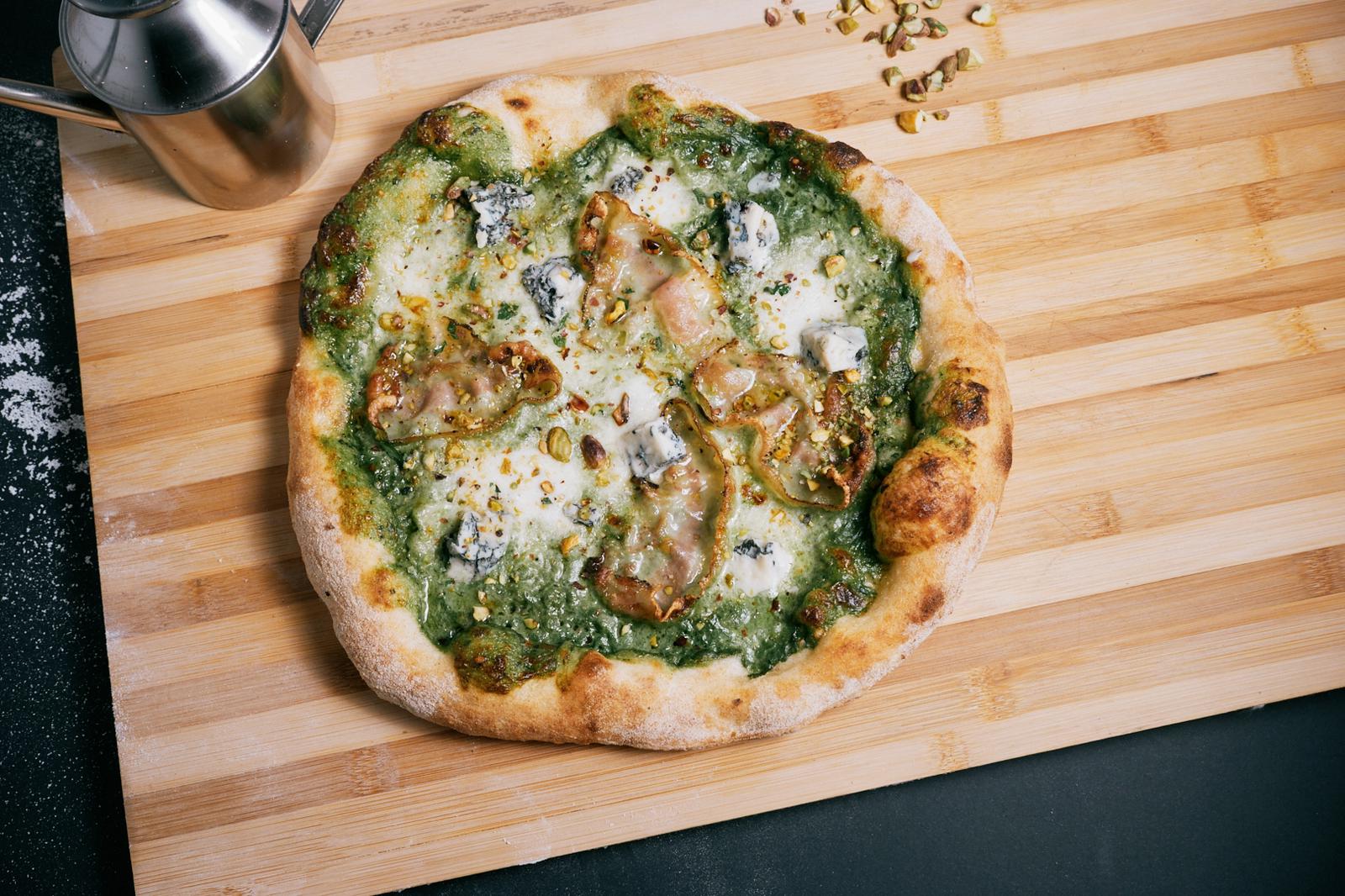 Salsa de espinacas Enzo’s, fior di latte, guanciale, gorgonzola, pistacho y aceite de oliva