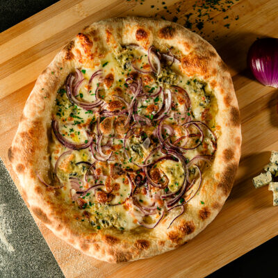 Salsa de tomate, parmesano, muzzarella, berenjenas asadas, gorgonzola, perejil y aceite de oliva